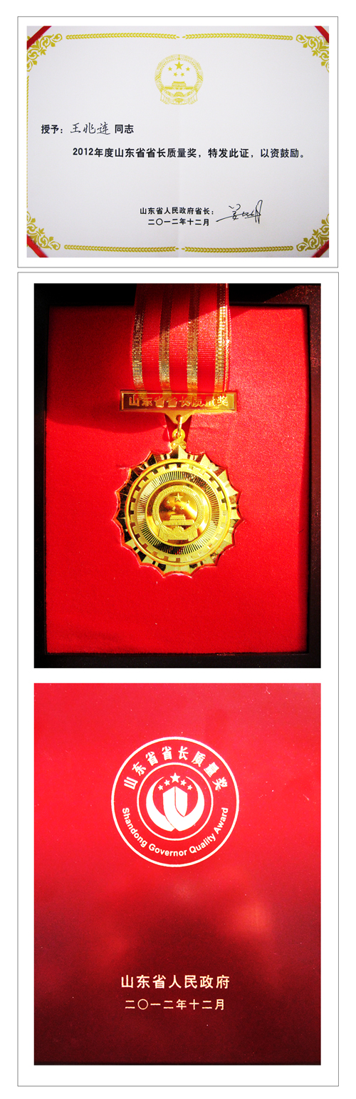繼2010年榮獲濰坊市市長質量獎后,公司董事長兼總經理王兆連同志又榮獲2012年山東省省長質量獎。1月11日,第四屆山東省省長質量獎頒獎活動暨質量強省工作座談會在山東省政府會議室舉行。會上,表彰了2012年山東省省長質量獎獲獎企業和個人,王董事長作為全省受表彰的獲獎個人之一,山東省省委副書記、省長姜大明親自為其頒發了獎杯。