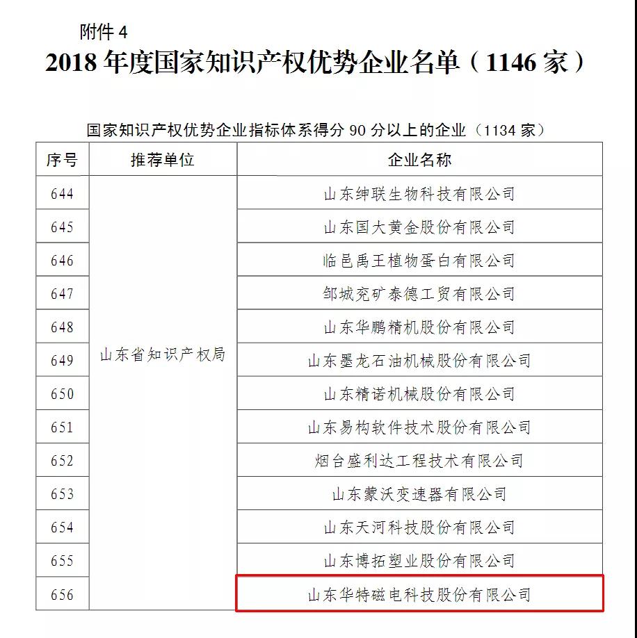 根據(jù)“國(guó)知發(fā)管函字〔2018〕158號(hào)”文件,經(jīng)企業(yè)申報(bào),各省、自治區(qū)、直轄市推薦,國(guó)家知識(shí)產(chǎn)權(quán)局審核,并經(jīng)社會(huì)公示,確定山東華特磁電科技股份有限公司等1146 家企業(yè)為2018年度國(guó)家知識(shí)產(chǎn)權(quán)優(yōu)勢(shì)企業(yè),新一輪或新確定國(guó)家知識(shí)產(chǎn)權(quán)示范企業(yè)、優(yōu)勢(shì)企業(yè)建設(shè)工作期限自2018 年8月至2021年7月。